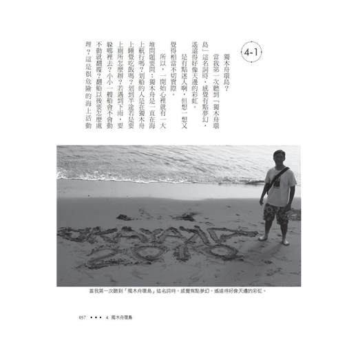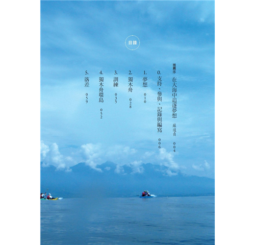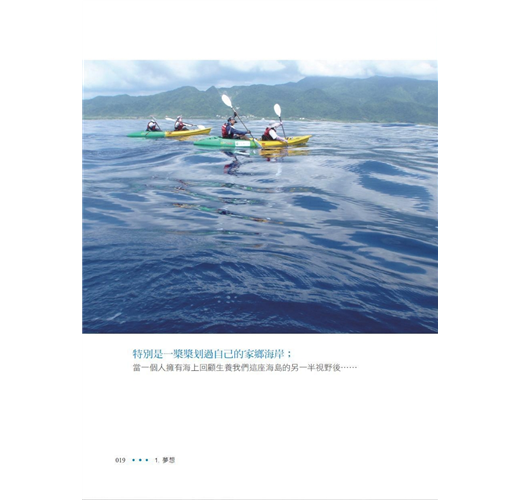 本書特色本書摘錄環台成員之記錄與日記,以主題分篇章,由各種不同面向的敘述拼湊環台經過。有訓練過程的痛苦,學生青澀的愛情,互相扶持的友情,也有熱血的成長。配合大量紀錄組所拍攝的照片,海洋飽滿的生命力似乎能穿透紙面,撼動海島子民的心靈。同時也加入討海人廖鴻基對獨木舟與海洋知識的專業觀點,兼具理性與感性,是一部激勵人心的好書。