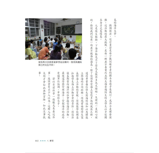 但台灣社會大多數人習慣走安全、安穩的路。社會這麼要求人民,學校也這樣要求學生,家庭不也是這樣限制、限定孩子嗎?當一個海島社會趨向於仰望熱鬧擁擠的中心而背離疏闊的大海,當然就會形成海洋自覺遲緩,形成種種不合理的海島社會現象。