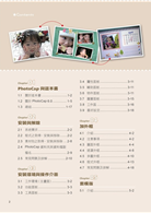 附錄中可查閱書附光碟的內容、PhotoCap的快速鍵、各種相關模版/範本的檔名定義及擺放位置、以及PhotoCap官方論壇的介紹。更貼心的替讀者們整理了一些輸出中心的資訊,讓您可以將完成的作品實體化,這是很棒的參考資料喔!