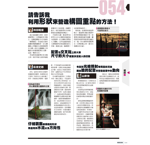 您有沒有注意過您是用右眼、還是左眼來看觀景器呢?您有想過不同顏色的搭配,會對相片產生什麼樣的影響嗎?拍照的時候,最好穿什麼樣的衣服呢?閃光燈的慢速同步,又是什麼東西呢?移軸鏡頭到底有什麼作用?風景相片用的泛焦技巧,到底是怎麼拍攝出來的呢?