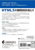 本書主要目的在於用簡單的文字,說明透過HTML 5多媒體元素將聲音和影像檔加入網站的完整編碼方式,除此之外,也將告訴你如何用CSS 3設計HTML 5的各種媒體元素,建立屬於自己的媒體控制選項。