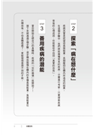 本書以「心理學」與「醫學」兩大角度切入,帶你重新認識疾病,透過3個步驟,180度反轉你對疾病的固有看法: