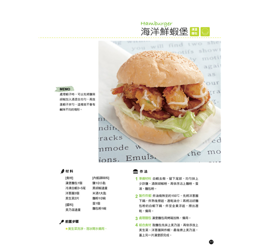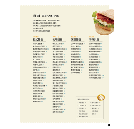 漢堡&三明治是全世界都風行的食物之一,在台灣也不例外,從早餐店、速食店、咖啡店到麵包店,都能看到它們的蹤跡。漢堡和三明治之如此受歡迎,除了做法簡單,靠著平底鍋和小烤箱,只要幾分鐘時間就能完成;而且方便攜帶,手抓即可食用。其次是三明治的營養十分均衡,兩片麵包提供了澱粉、肉類和雞蛋等蛋白質來源、蔬菜水果則含有維生素和纖維質。加上它的口味豐富多變,鹹甜、冷熱皆宜,便於發揮創意,也大大增加了製作與品嚐的樂趣。