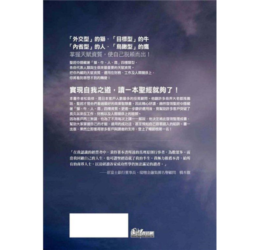 本書作者松島修,是日本客戶人數最多的投資顧問。他聽許多商界大老都推薦說,聖經才是他們看過最好的商業智慧書,因此精心研讀,赫然發現聖經中隱藏著「獅、牛、人、鷹」四種資質。更進一步鑽研運用後,竟幫助許多客戶突破了長久以來在工作、財務以及人際關係上的瓶頸。
