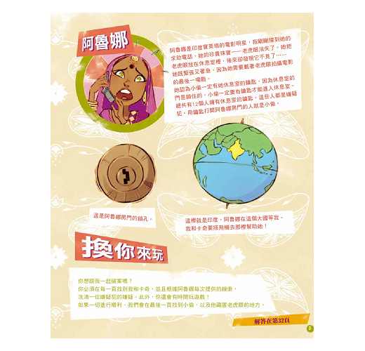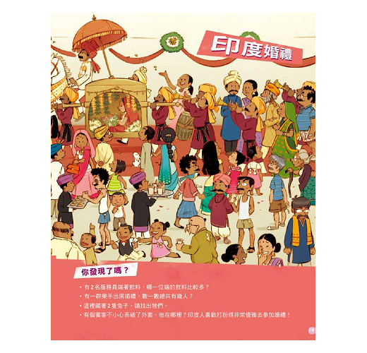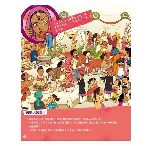 除了掌握線索,揪出小偷外,你還要睜大眼睛,好好觀察印度喔!快看看印度人的食、衣、住、行、娛樂,跟臺灣有什麼不一樣呢?具備這些知識才能回答更多書中的謎題!