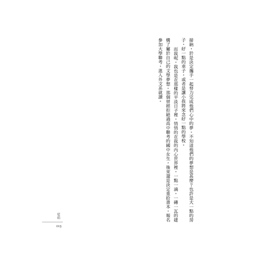 而我呢,我也是在那樣的平淡日子裡,悄悄的在我的內心世界裡,一點一滴,一磚一瓦的建構了屬於自己的文學夢想。那個曾經拒絕過高中聯考的國中女生,後來還是決定重拾書本,報名參加大學聯考,進入外文系就讀。