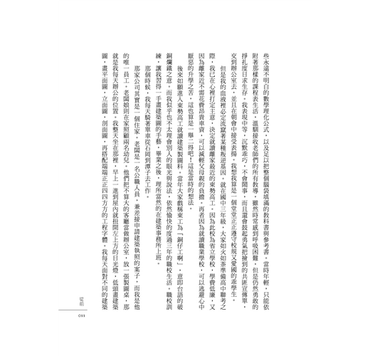 那家公司其實是一個住家。老闆是一名公職人員,兼差接申請建築執照的案子,而我是他的唯一員工。老闆娘則在家照顧兩名幼兒。他們把不算大的客廳當做辦公室,放一張製圖桌,那就是我每天辦公的位置。我整天坐在那裡,早上一進到屋內就扭開左上方的日光燈,低頭畫建築圖,畫平面圖,立面圖,剖面圖,再搭配端端正正四四方方的工程字體。我每天面對不同的建築物設計圖,類似的直線條,握著削得尖銳的鉛筆,有柔軟的橡皮擦為伴,從早上畫到傍晚。