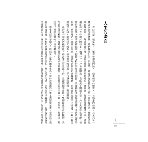 有時候是一種氣味,一張似曾相識的臉,一個不經意的轉彎,一首熟悉的曲調,甚至只是一陣迎面而來的微風,她們瞬間化為一只風箏,隨意牽迤拉扯出遠方的一處寂靜角落。仔細循著這條細微線索,一路追溯過去時,這時而穩直又忽然顫抖的一條直線,便隨著風兒飄搖不定,隨意灑落出一件件塵封的往事。她們一片一片地散開來,在陽光下閃耀光芒。於是風景衍生情節,情節形成故事,故事透露細節,細節又折射出更多的細節。然後頓悟強如陽光照耀,才清清楚楚的明瞭,原來時光未曾真正告別。度過的光陰宛如巨輪轉動,而碾過的歲月早已成就了一幅一幅美麗的浮水印。縱使時光流逝,這些獨特的印記,早已烙印牢固,難以磨滅。