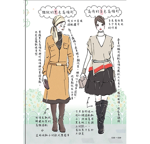 高領毛衣上再套上開襟針織衫,有拉長脖子的視覺效果,襯托出女性柔和的線條。也可以利用皮帶變換花樣,或搭上外套,穿搭出與針織衫的質料對比。
