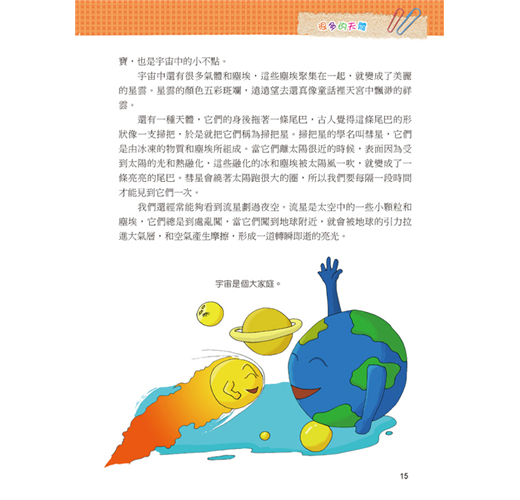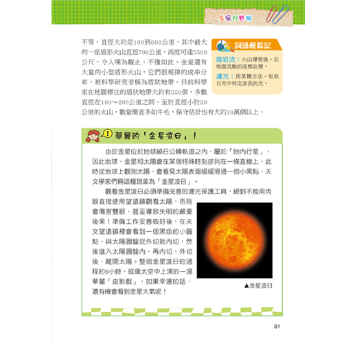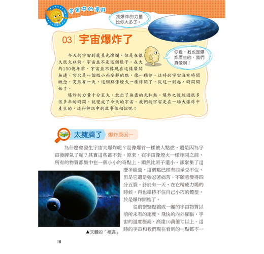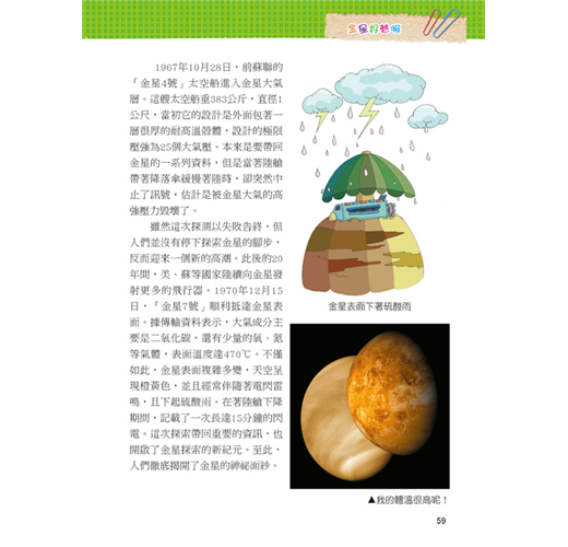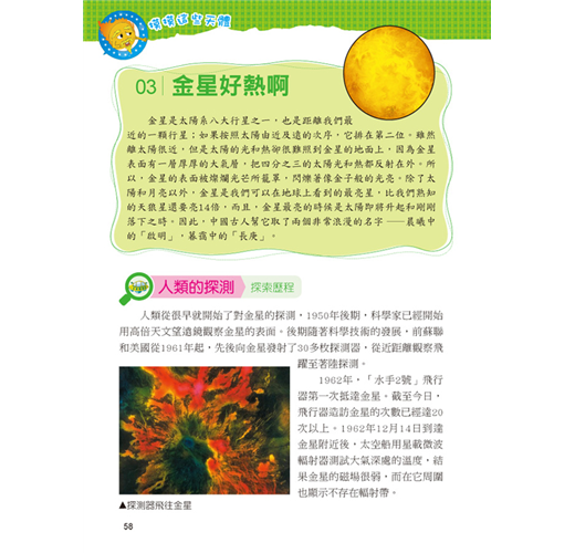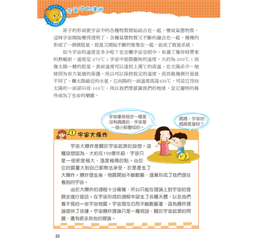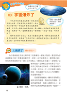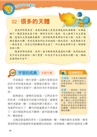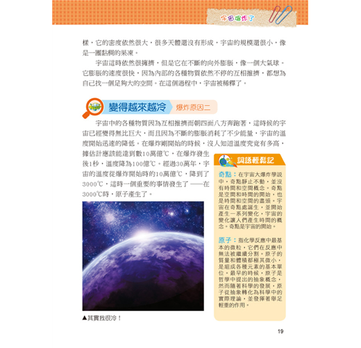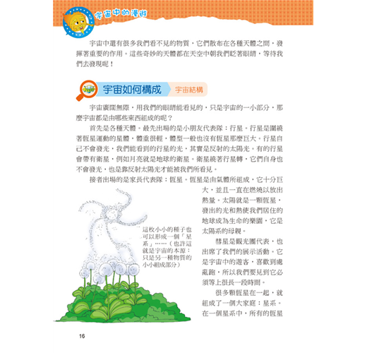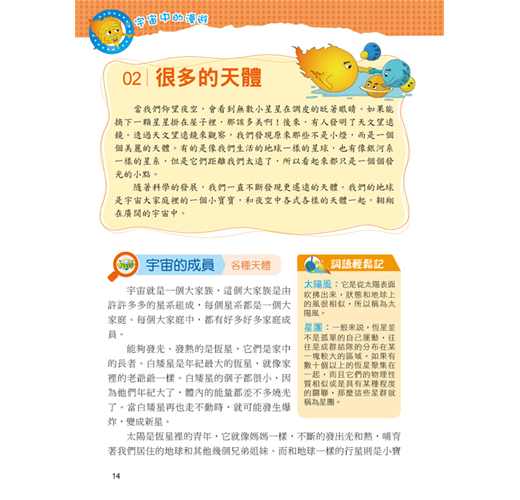 一直以來我們都想從其他的星球上發現其他的物種,可是在經歷了探訪之後,什麼也沒發現,但是透過求知慾望及科技發展,卻了解了更多宇宙的奧祕。本套網羅廣泛科學中有趣的主題,以擬人化的插圖對話方式,可在閱讀時重點式的了解主題內容的特色,增添學習樂趣;詞語輕鬆記單元,挑選文中具有意義或較難理解的詞語,以專文說明,讓學習理解更透徹。