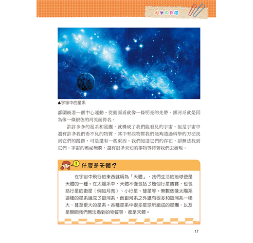 廣大的宇宙中還有和人類一樣的生物存在嗎?那些電影裡眼的外星人,真的擁有比人類更高科技的技術嗎?有太多太多神祕的問題需要一一解開,但在這之前,先讓我們了解宇宙中的天體與科學知識吧!