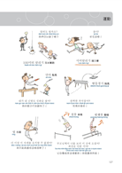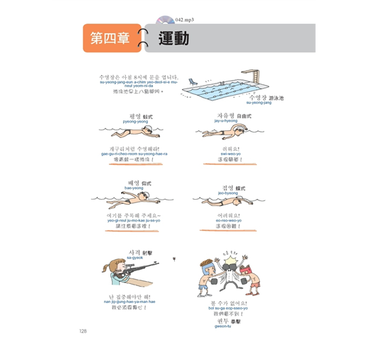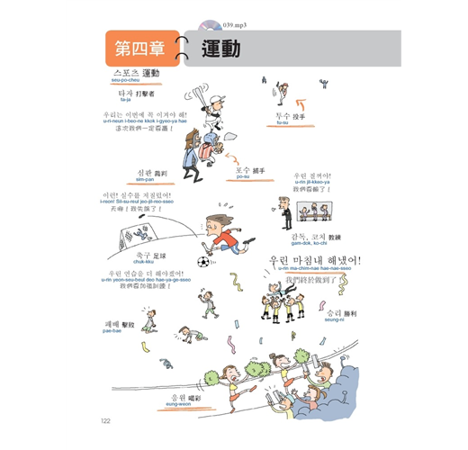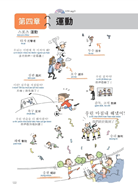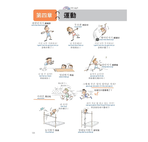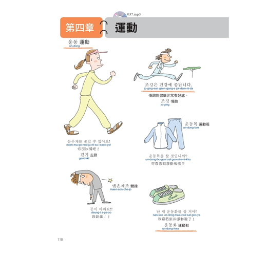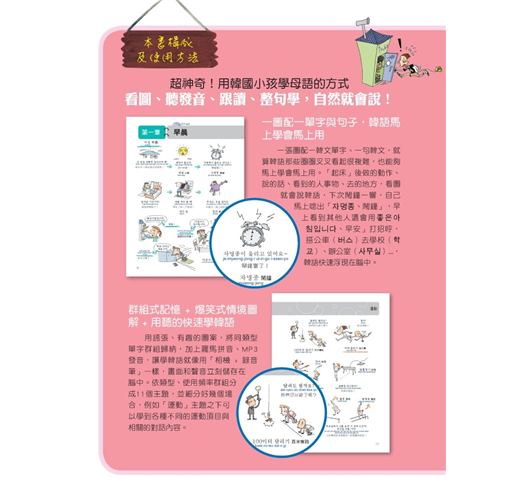 用裁判鳴槍打下一隻小鳥的圖像來記「百米賽跑」的韓語,用這樣的方式學習,就像小孩子學語言一樣,越好笑的事物,越能深刻記憶,本書利用誇張、有趣的圖案,將同類型單字群組歸納,並加上羅馬拼音、MP3發音學習,讓學韓語就像用「相機 + 錄音筆」一樣,畫面和聲音立刻儲存在腦中。本書的範圍廣闊,將韓國生活大小事中的單字及句子依同類型、使用頻率群組分類成十一個主題,這些主題之下還會細分好幾個場合,例如在「大都會」的主題之下有一個是關於「郵局」的場合,讀者會學到與「郵局」相關的人(郵差、寄件人等等)、物(信、快遞、郵票、包裹等等)、地(郵局)以及相關的動作(遞送、收件等等)與相關的對話內容,讀者只需要看本書滿滿的爆笑圖解、聽M3記相同性質主題的韓語,就能同時啟動右腦的圖像記憶與左腦的語言邏輯推理,輕鬆學習又能記得長久。