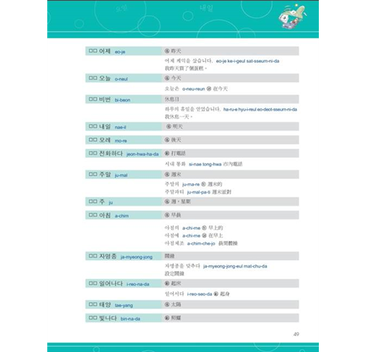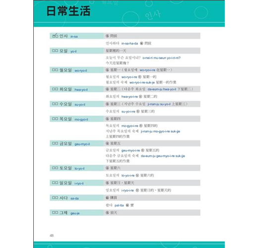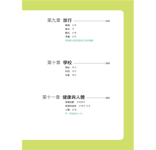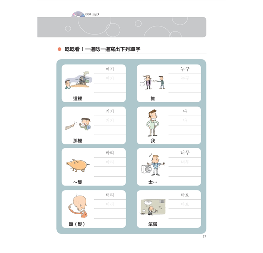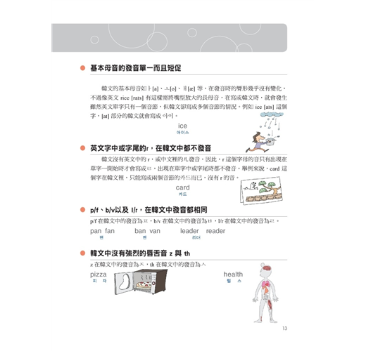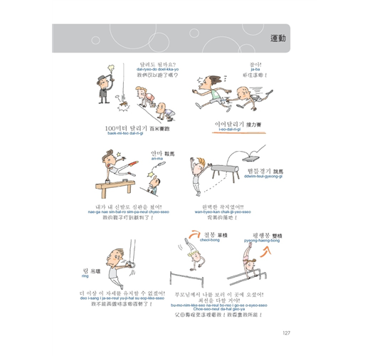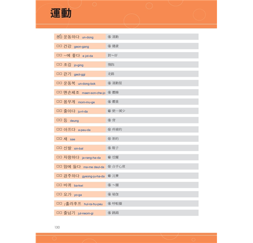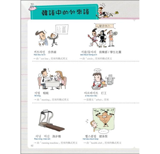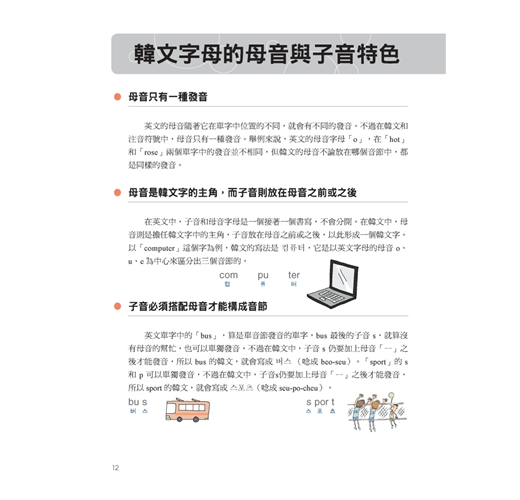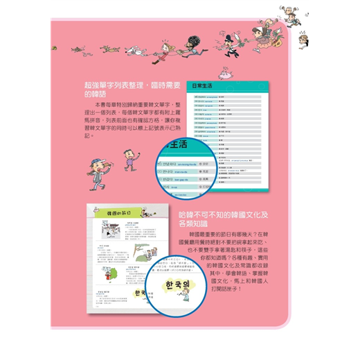 一般圖解韓語書,只簡單的把圖跟韓語單字配對完就沒事了。本書除了有那些讓你看到就會哈哈大笑的圖解之外,韓語單字、句子旁也都有標上羅馬拼音以及中文翻譯,在每一章最後還特別地歸納本章所有的單字而整理出一個列表,並補充說明相關的同義字、反義字、文法重點與例句,韓文單字前面還有確認方格,讓你能輕鬆複習所有韓文單字。