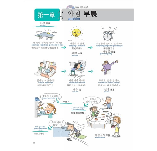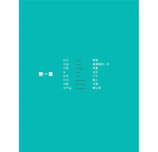 韓語看起來很複雜,那只是因為新學一種語言所感到的陌生感而已,本書一張圖配一個韓文單字、一句韓文,就算韓語的那些圈圈叉叉看起來再複雜,也能夠馬上學會馬上用。就像韓國小孩學韓語一樣,自然而然的將每天看到、聽到的韓語記住。「起床」後會做的動作、會說的話、會看到的所有人事物、會去的地方,在本書用看圖的方式立刻學會韓語的表達法,下次鬧鐘一響,自己馬上唸出「ja-myeong-jong、鬧鐘」,穿衣服時立刻說出「o-seul i-beo-yo」,早上看到其他人還會用「jo-eun-a-chi-mim-ni-da、早安」打招呼,搭公車(beo-seu)去學校(hak-kkyo)、辦公室(sa-mu-sil)...,一堆韓語都能快速浮現在腦中。