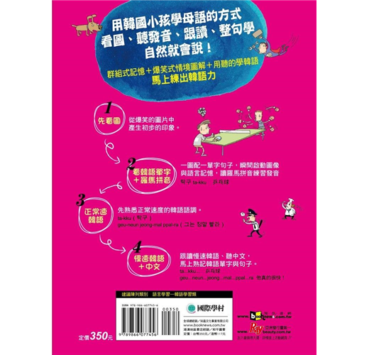 韓國小孩怎麼記韓文單字?絕對不是痛苦地把韓文一個字一個字背下來!韓國小孩依每天所看到的、聽到的事物,就能輕輕鬆鬆的記住句子,而記住一個句子就等於記住好幾個最實用的單字。所遇到的事物越突兀、爆笑,句子及單字留在腦袋中的印象就會越深刻!本書滿滿的爆笑圖解與文字,讓您的腦袋在不斷的新奇刺激下,就像韓國小孩一樣,不用特別死記硬背,就能對單字跟句子留下深刻的印象。