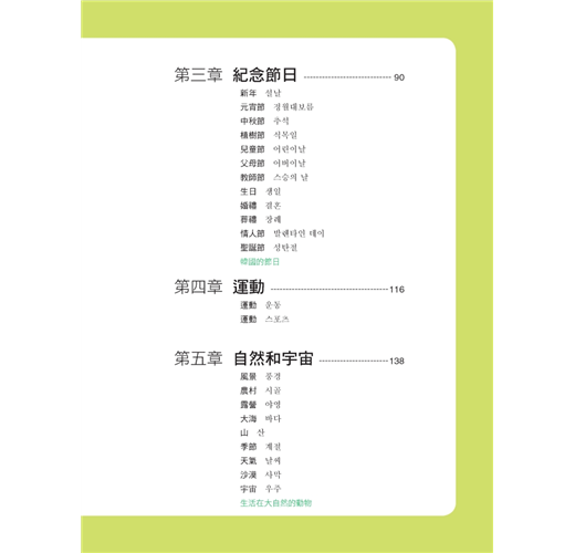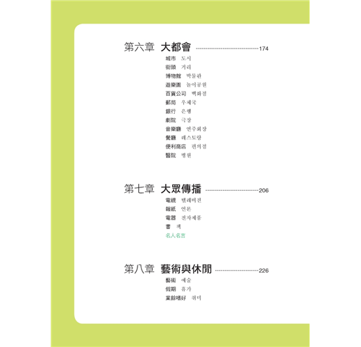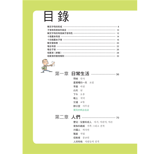 到韓國突然要表達的「人、事、時、地、物」用手一指都能通。特別想找「列車長、飯店行李員」、特別想表達某個時間「下午」、地點「在銀行」、動作「換錢」、物件「硬幣、鈔票、美元」等等,翻本書用手一指就能造出自己想要表達的句子。使用本書詳細的目錄,查詢「車站篇、旅館篇」用手一指相對應的圖片與中文就可以找到你要的人。翻到「日常生活主題章」可以找到你要的時間、翻到「大都會主題章」可以找到「銀行」、在「銀行篇」可以找到「換錢」動作的表達與常用錢幣的表達。