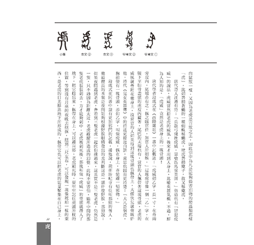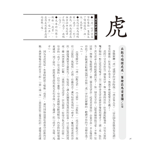 ◎「虎」的甲骨文字形像極一隻張大了嘴的猛虎,頭、爪、尾俱全。