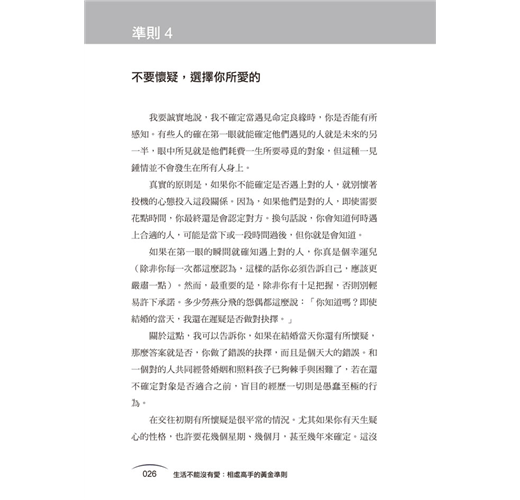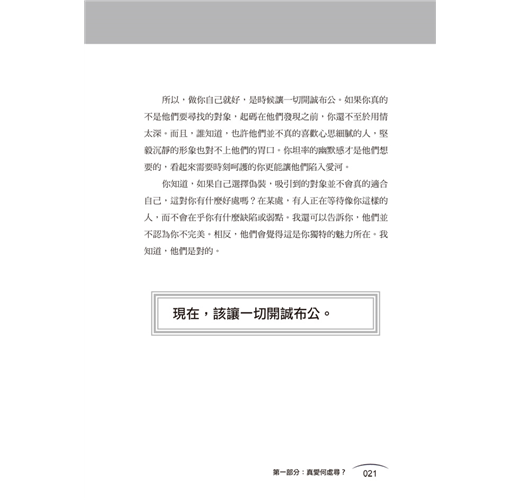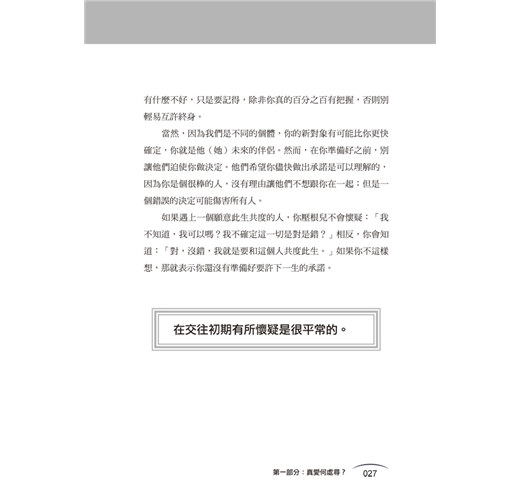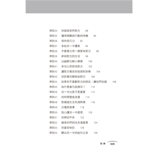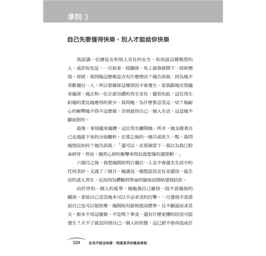 書中大部分提到的準則,都是所謂的常識,很可能你已略知一二,卻沒有去了解其中的精髓。與所有我其他的準則書籍相同,把這些條列在書中的指引當作日常生活中時刻力行的提醒,而不是神來一筆般的啟示。要知道,愛並非如此艱澀,好似藏有很多祕辛讓你無法參透。有時候,我們只是失去了自己的定位,需要一些提醒來重新思考,如果要使自己和周遭的人有著持續及深刻的連結關係,我們該重視什麼?又該如何去做?