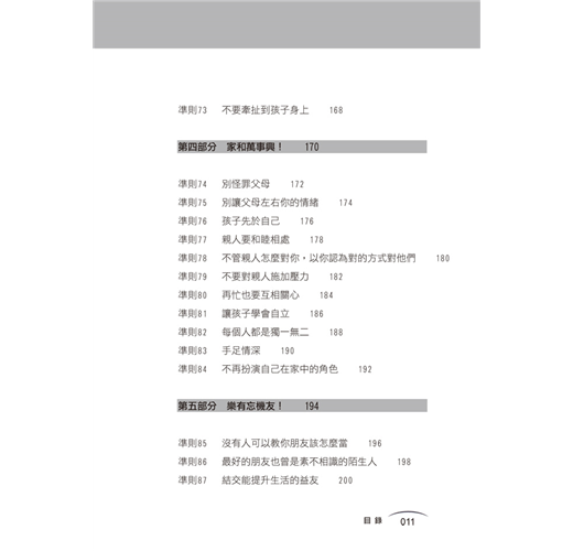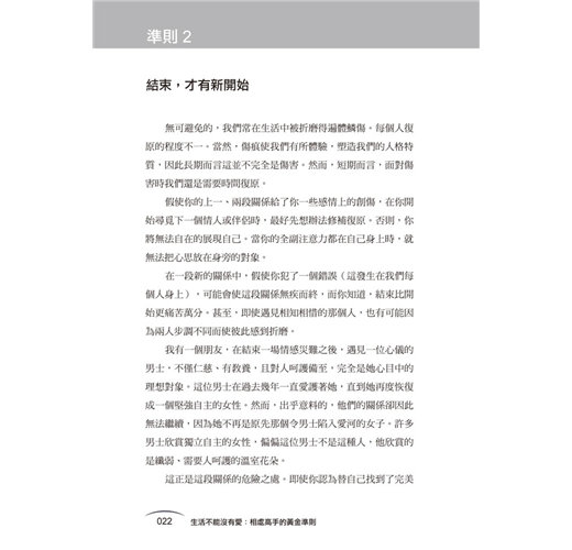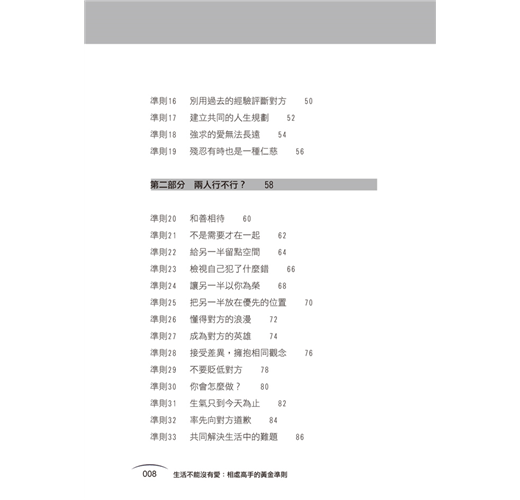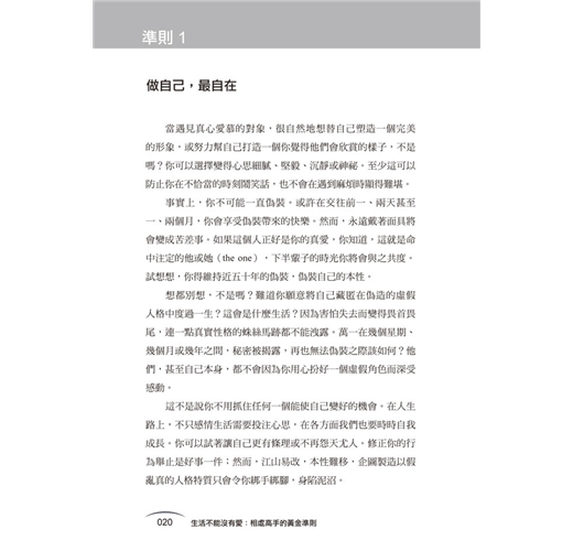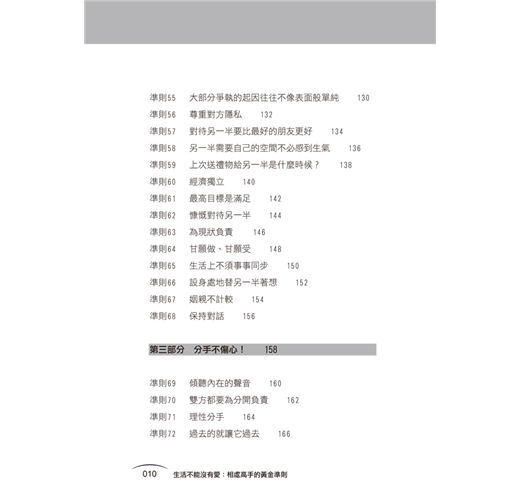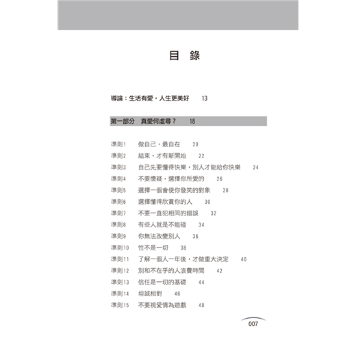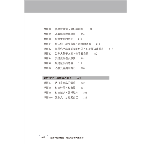 這本書分成了幾個章節,方便索引使用。其中包含了真愛何處尋、兩人行不行、分手不傷心(這部分的準則不多,因為你不會想要總是沉緬傷懷)、家和萬事興及樂有忘機友,及真情滿人間。有些原則在各項關係中似乎通用,所以我把它們放在看起來最合適的部份,如果你不能同意我的分類方式也請包涵。同時,最後一個部份裡有幾個準則是我認為在任何情況下都適用的,所以我把它們收集起來放在最後,為真情滿人間。