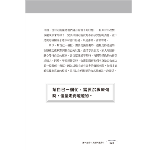所以,幫自己一個忙。需要沉澱療傷時,儘量走得遠遠的,在隱蔽之處默默調整自己的狀態,盡情享受朋友、家人的陪伴,靜心等待自己的復原。當復原進展不錯時,再開始尋找新的伴侶或情人。同時,尋找新伴侶時,也謹記觀察他們本身是否也在之前一段關係中復原。因為這樣才能有更多的發展空間,你們才能看見彼此真實的模樣,並且以你們想要的方式持續這一段關係。