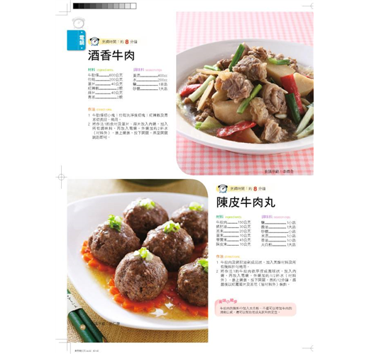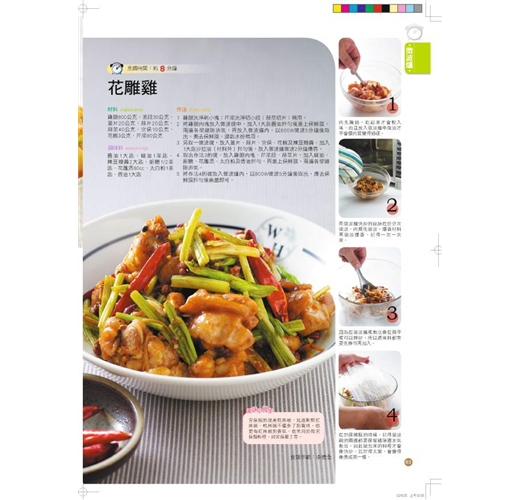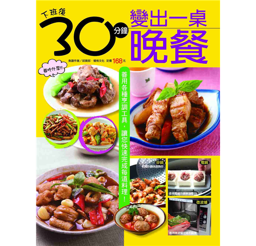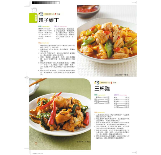 微波爐篇(另收錄微波爐清洗保養祕訣),菜單有:辣子雞丁、三杯雞、花雕雞、酸菜炒肉絲、蔥爆豬心、黑椒牛柳、沙茶牛肉、滑蛋蝦仁、炒海瓜子、麻婆豆腐、花生炒丁香、椰汁咖哩蝦、蒜香排骨、宮保牛肉……等。