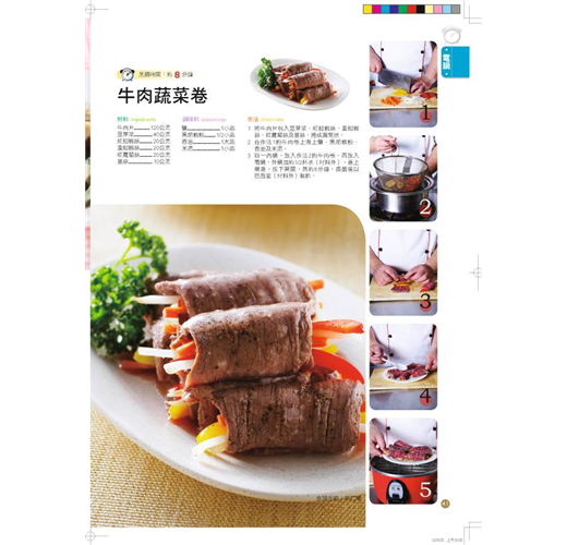 電鍋篇(另收錄電鍋清洗保養祕訣),菜單有:荷葉雞、芋香蒸雞腿、番茄豆腐肉片、酒香牛肉、陳皮牛肉丸、牛肉蔬菜卷、百花高麗菜捲、泰式檸檬魚、南瓜蒸肉片、日式角煮、梅子蒸肉片、客家釀豆腐、鹹冬瓜蒸肉餅、優格燉肉、橄欖醬蒸魚片、歐風燉蔬菜、蒜味蒸螃蟹……等。