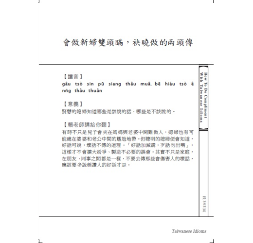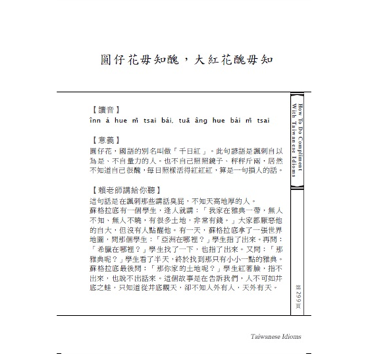 老祖先在:為人處事、應對進退、投資理財、言談舌戰之間,遺留很多智慧的話,轉化成好唸、好聽、又好記的台灣諺語。 四百多年來,一句一句,傳承下來。歷經四百年時空的轉變,至今仍是,句句箴言、字字珠磯,毫無褪色,真可謂歷久而彌新。