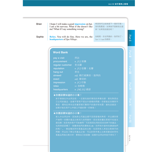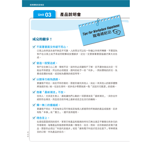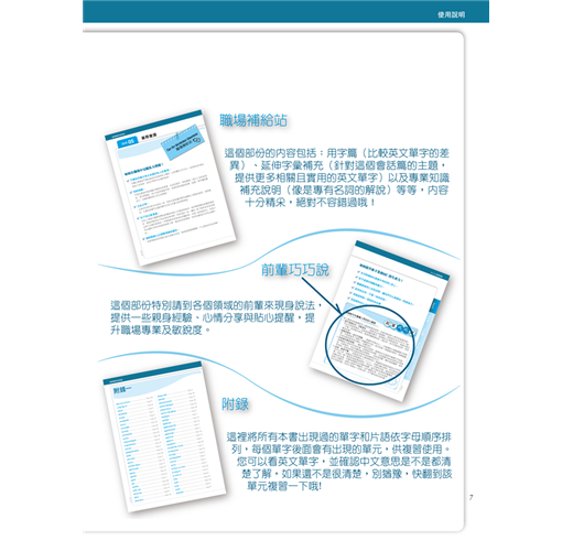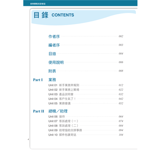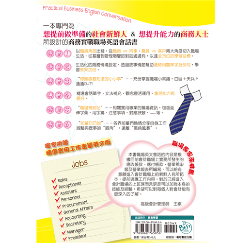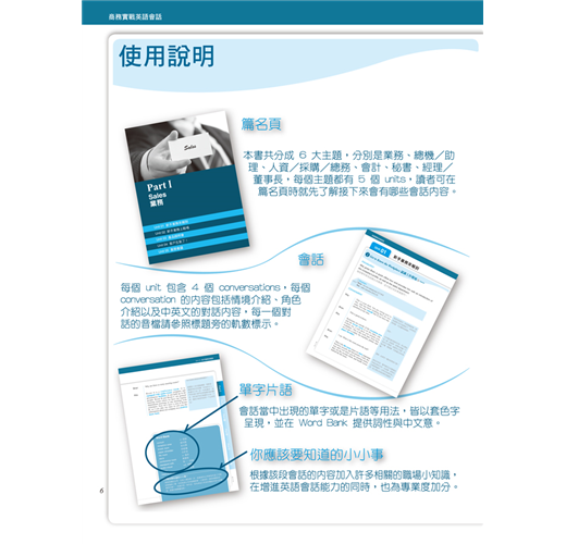 從總機、助理、業務、採購到管理階層的對話實錄,達到全方位的學習目標,英語學習不只要學一個點,而是要學一整套,才有辦法活用。