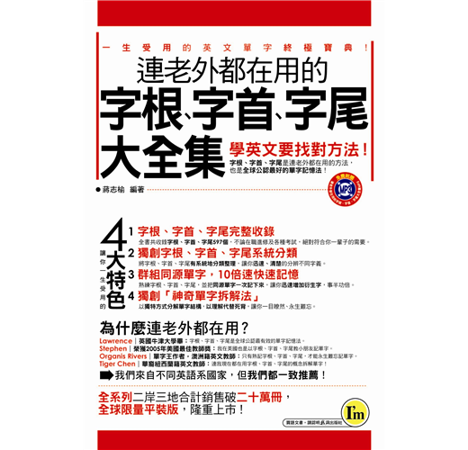 《連老外都在用的字根、字首、字尾大全集(平裝版)》裡教讀者如何用理解取代死背,了解單字的源頭和組成方式不但能幫助你靈活運用這個字,更能有系統的同時記起和它同源的其他延伸字彙。而我獨創的「神奇單字拆解法」,更能讓你爾後遇到不認識的單字也能利用字源方式去推測出其單字解釋。