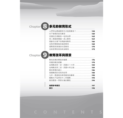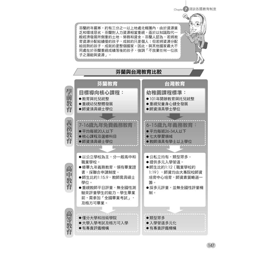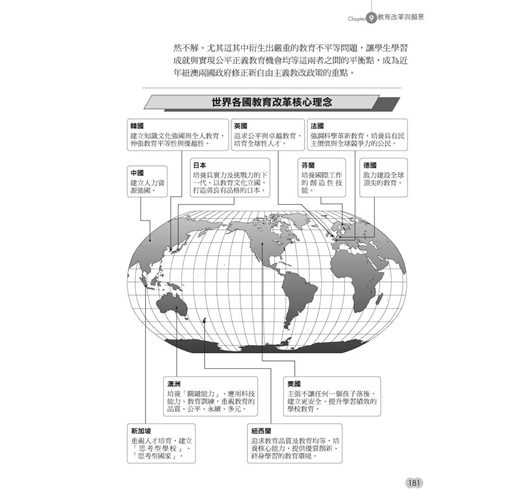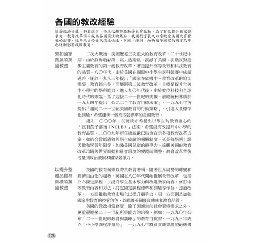 最後,書中亦收羅簡介各國的教育制度,說明各國教育的定位與特色,從中吸取經驗,重新思考台灣目前的教育環境。