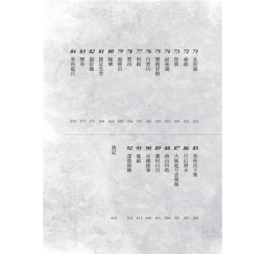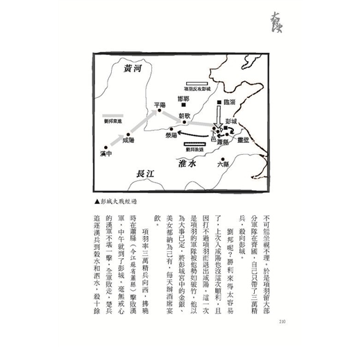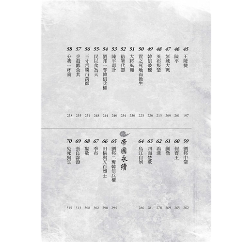 本書內容分為〈秦失其鹿〉、〈楚漢爭霸〉、〈帝國永續〉三部分,擅長讀史、解史的歷史評論家公孫策,以司馬遷的《史記》為主桅,輔以《資治通鑑》、《敦煌變文》,將最具傳奇性、記敘最精采的楚漢之爭,以生動洗練的文字重新詮釋,透過紙頁呈現活生生的歷史舞台,讓讀者親眼見證秦、楚、漢的敗亡與崛起。