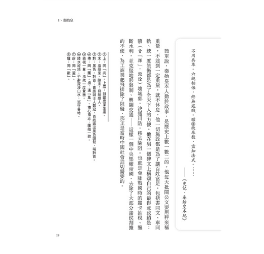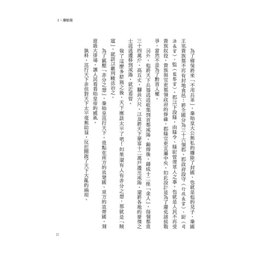 簡單說,秦始皇本人勤於政事,是歷史上數一數二的。他每天批閱公文要用秤來稱重量,不達到一定重量,就不休息。他一切施政都是為了讓百姓富足,包括書同文、車同軌、統一度量衡都是為了全天下人的方便。他在另一個碑文上稱頌自己的最得意政績是:隳(音「揮」,毀除)壞城郭,決通川防,移去險阻。也就是免除戰國時的關卡抽稅、壟斷水利,並克服地形限制、興闢交通──這樣一個中央集權帝國,去除了大部分諸侯割據的不便,為工商業起飛排除了阻礙,那正是當時中國社會迫切需要的。