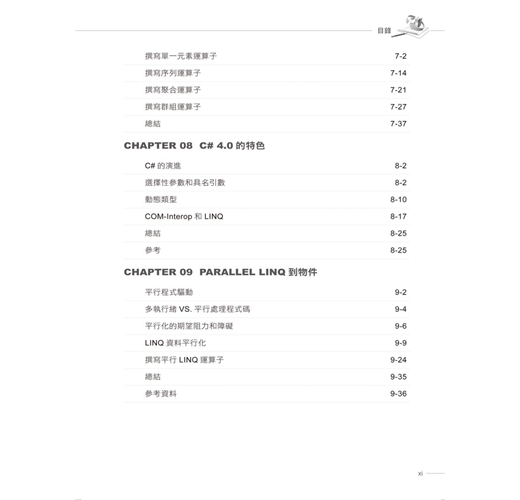 • 使用LINQ的並行物件(PLINQ)優質化查詢多核心處理器,以及建構自定的並行查詢操作。