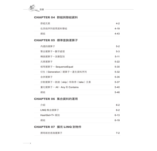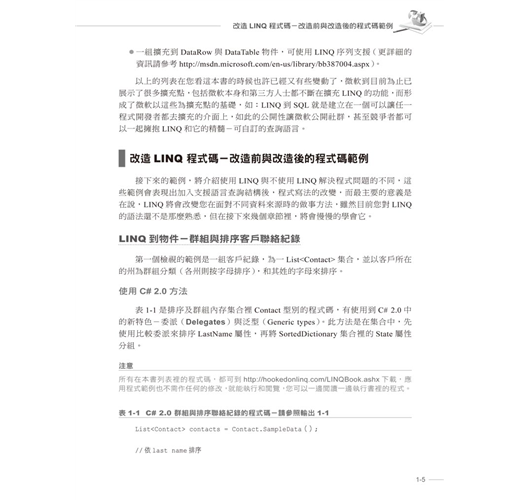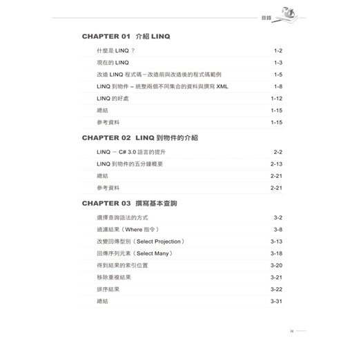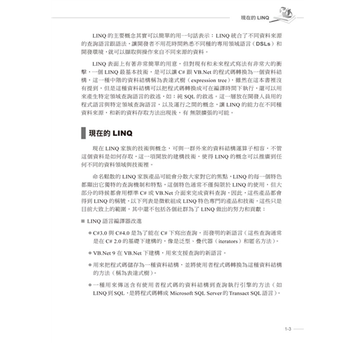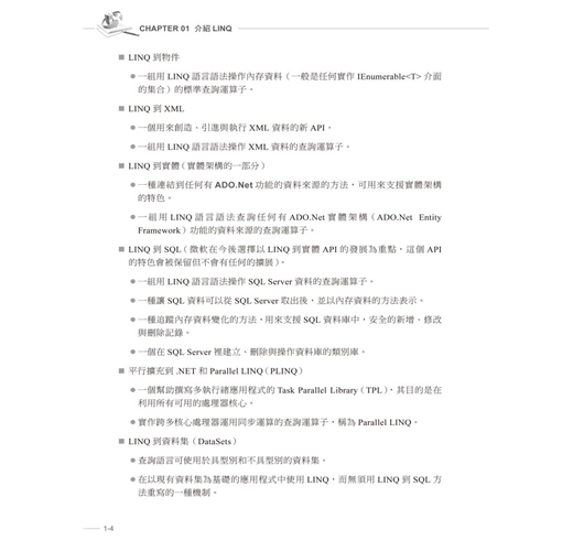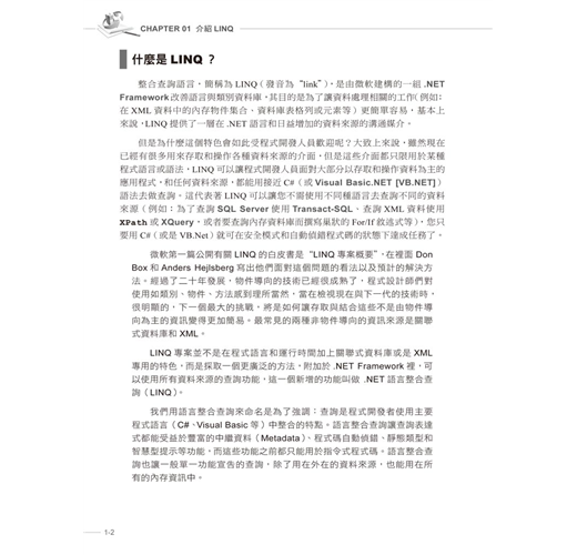 本書重點集中在LINQ語法以及存取記憶體中的資料集合(in-memory collections),而不是著重在取代其他的資料庫查詢技術。LINQ 吸引人的地方在於:一旦你掌握了它的語法和查詢程式的精髓,就不用為任何不同資料來源多做修改。