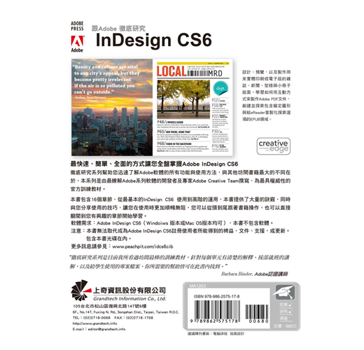 最快速、簡單、全面的方式讓您全盤掌握Adobe InDesign CS6 徹底研究系列幫助您迅速了解Adobe軟體的所有功能與使用方法,與其他坊間書籍最大的不同在於,本系列是由最瞭解Adobe系列軟體的開發者及專家Adobe Creative Team撰寫,為最具權威性的官方訓練教材。
