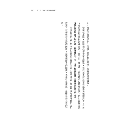‧「大局著眼,小局著手」的將棋世界,經常要站在大局的視野,思考對方可能的出手,並決定自己的每一步,逼迫對手,可以說是和工作、商業共通的世界。書中充滿著寶貴的提示,扎扎實實的介紹,對不下將棋、不懂將棋的人來說,也能帶來思考的刺激。