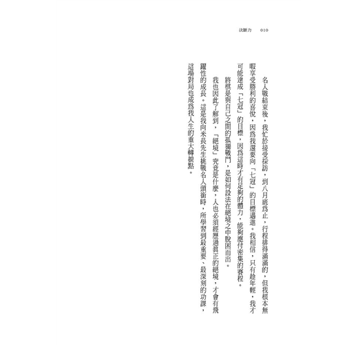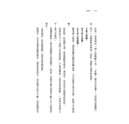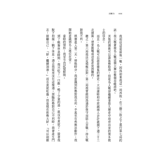 ‧生存可以說是一連串的決斷,瞬間的躊躇可能就丟了性命。在不允許絲毫躊躇的將棋世界,創造出非凡實績且一直維持著挑戰者姿態的羽生善治,他的經驗、見識,為在變化飛速的社會求生的現代人,關於如何作決斷,提供了真實而實用的建言。推薦大家務必一讀。