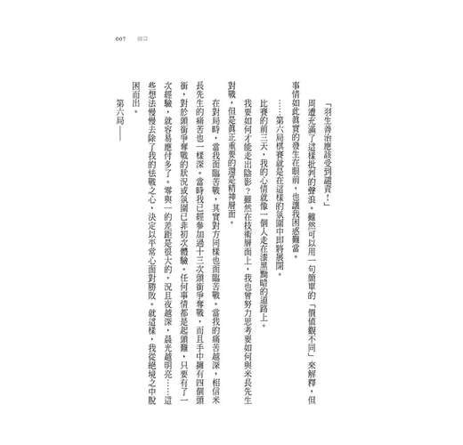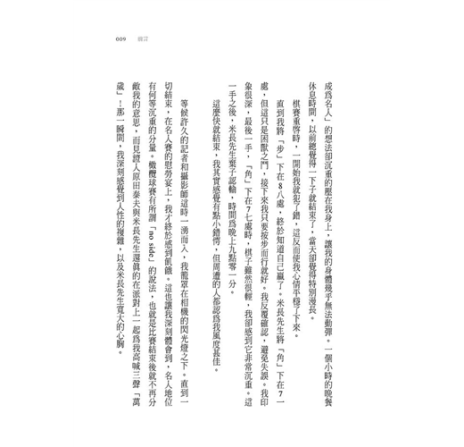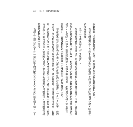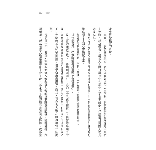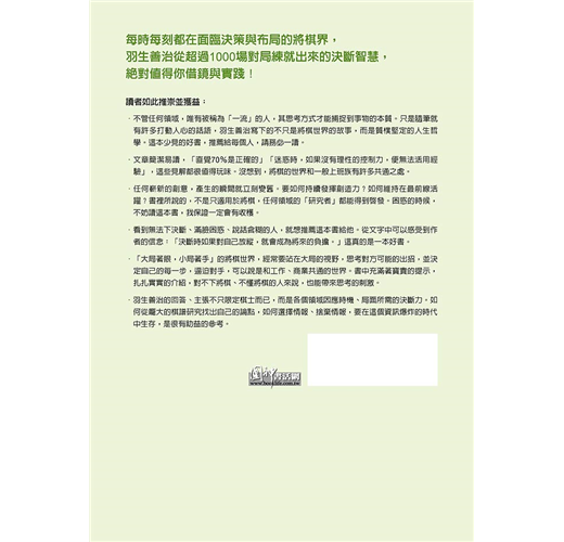 ‧不管任何領域,唯有被稱為「一流」的人,其思考方式才能補捉到事物的本質吧。只是隨筆就有許多打動人心的話語,羽生善治寫下的不只是將棋世界的故事,而是質樸而堅定的人生哲學。這本少見的好書,推薦給每個人,請務必一讀。