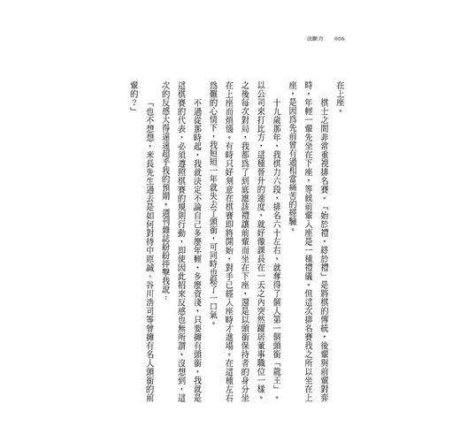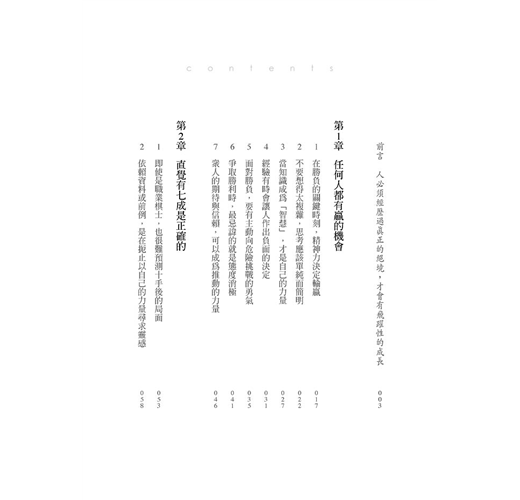 ‧文章簡潔易讀,「直覺70%是正確的」「迷惑時,如果沒有理性的控制力,便無法活用經驗」,這些見解都很值得玩味。沒想到,將棋的世界和一般上班族有許多共通之處。