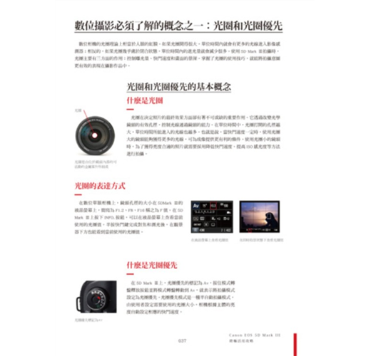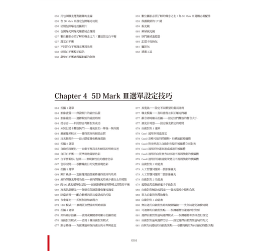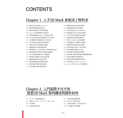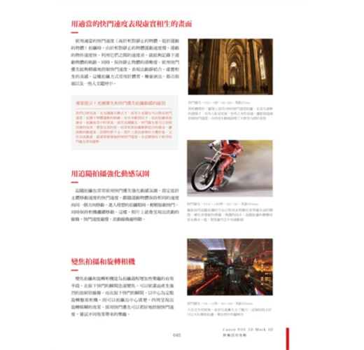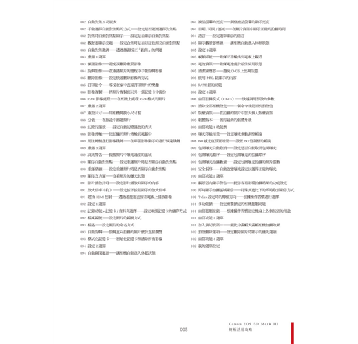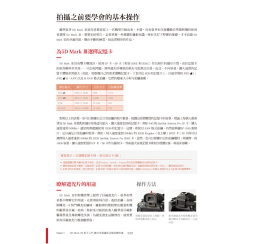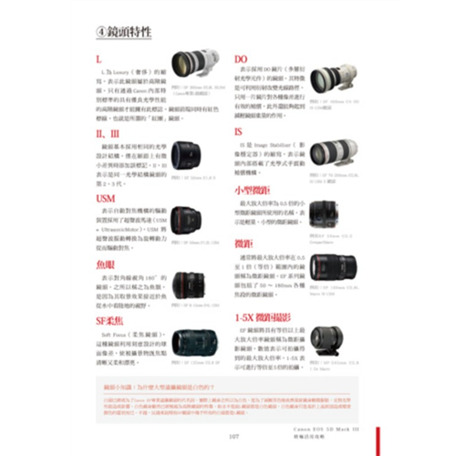 書中以淺顯易懂的方式詳盡解析了5D Mark III的的選單設定,並針對不同的場景和拍攝需求提供專業的指導建議。此外,更針對5D Mark III的超優質表現,依照不同的焦段、拍攝需求及價位精選了14支鏡頭,讓讀者們能夠依照自己時常遇到的拍攝環境與需求能夠,準確且理性的選購鏡頭。