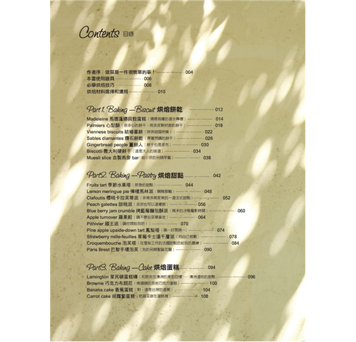 ◆ 內含餅乾、蛋糕、麵包、甜點、鹹品、甜品、糖果和飲品等完整的西點類別,傳統加創新,風味獨具。