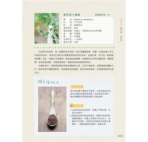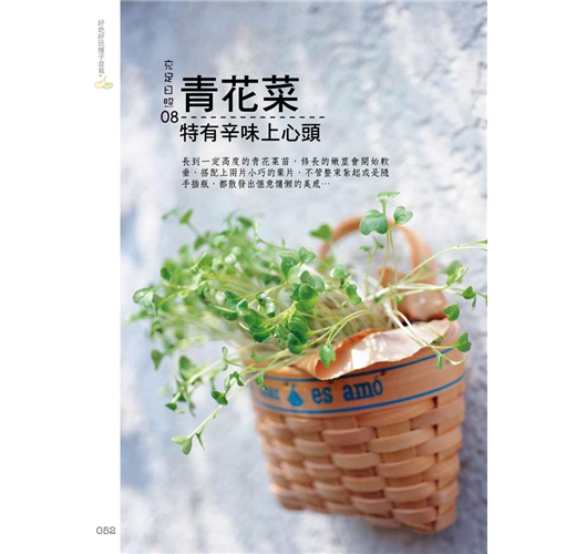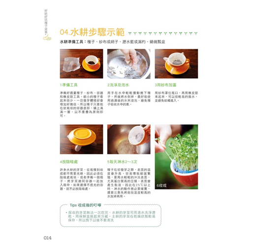 每一類種子都會標示種子篩選處理、催芽技巧、適合的容器深度/高度、栽種溫度、日照需求、採收天數,讓你順利將種子種成一片鮮綠小森林。你還可選搭杯盤、陶瓷、玻璃瓶罐等喜歡的器皿,擺設在窗邊、餐桌、廚房一隅,可愛多樣的姿態,也是點綴居家環境的一抹綠意。