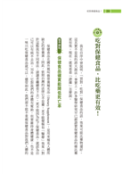 保健食品吃錯了,更要命! 保健食品可健身也可傷身,你知道怎麼吃才對嗎? 市面上推薦介紹保健食品的書百百種,為什麼我還要特別寫一本「保健食品」的書呢?身為腎臟科醫師,聽到那麼多似是而非的說法,看到那麼多魚目混珠的產品,見到那麼多「以身試法」的消費者,我覺得必須站出來跟大家說清楚一件事,那就是──吃錯保健食品,只會越補越大洞。 買錯、吃錯保健食品風險大 現代人崇尚健康,保健食品已成為多數人每日營養補給的必需品。據IT IS產業分析資料顯示,2010年全球保健食品市場約為3,058億美元,相當可觀;而台灣市場也是如此,根據IMS調查,單單2011年國人花在保健食品上的錢就接近900億,而衛生署調查也發現,國內有超過半數以上的人有吃保健食品的習慣。 這麼多人吃保健食品,可見國人相當注重身體保健,可是為什麼國人的健康卻越來越差呢?除了生活習慣、環境變化的影響外,我個人覺得吃錯、用錯保健食品也是不容忽視的原因。 道聽塗說 保健食品概念差 雖然保健食品目前正夯,人人都知道要適時補充,但卻往往概念不足,在臨床上我也發現,國人買保健食品簡直像在買零食,不僅事前不做功課,購買時也不會檢查標示、產地、認證,通常都是聽人說不錯,就跟著買了。這點從國內某知名健康雜誌所做過的市場調查完全不謀而合,而該項調查甚至也直接點出,知道保健食品與藥品有交互作用的人不到一成,由此可見國人對保健食品的概念有多薄弱。 可是坊間的健康食品是越來越多樣化,加上法令放寬、市場開放,目前除了藥房、藥妝店外,連電台、便利商店、超市,甚至網路都開始販賣保健食品,還有直銷、傳銷機構的人員口沫橫飛的介紹,在概念與相關知識不足的前提下,國人又怎能藉由適當補充營養品來讓自己更健康呢?更何況,坊間的保健產品良莠不齊,充斥著許多標示不明或品質惡劣的商品,不僅打壞了營養保健食品的名稱,嚴重者甚至會讓消費者吃出問題。 像全球著名的營養補充品的監督網站「ConsumerLab.com」就曾檢驗二十一種不同品牌的綜合維他命,結果發現竟有十一種不符品質標準;當中有些是「不符自身標示含量」,例如檢驗出來的鈣只有標示量的一半,或是超出劑量比標示還多三倍;有些則是含有「重金屬汙染」,例如產品含鉛等;另外還有一種是「藥丸溶解度不佳」,也就是服用後的溶解時間超過美國藥典規定的三十分鐘,導致吸收效果受到影響。 吃補不吃毒 才能真正保健康 這些含毒、過量或不足量的保健品讓我這個腎臟科醫師越來越擔心,特別是我發現國內的洗腎人數節節攀升,使尿毒症幾乎成了新國病的代表。據美國腎臟登錄系統USRDS2007 年公佈資料顯示,台灣洗腎病患占總人口比率(盛行率)與每年新增加洗腎病患比率(發生率)皆為世界第一,這不正是一大健康警訊嗎? 你或許會問,這和保健食品有什麼關係呢?事實上,保健食品雖然不是藥物,但是因為製作過程受到汙染或是劑量不對、保存方法有誤等因素影響,都可能讓原本的吃補變成吃毒,對腎臟造成嚴重威脅。 我們腎臟科醫師有句話這麼說,「事前避免使用一毫克可能引發腎毒性的藥物,絕對勝過事後一公升的洗腎藥水。」既然國人如此重視保健食品,而保健食品的確也對我們的身體健康有所幫助,那麼就應該知道如何正確的選購、正確的服用,讓營養保健食品達到真正的保健目標。 這也是我撰寫此書的初衷,希望大家都能擁有健康的身體。