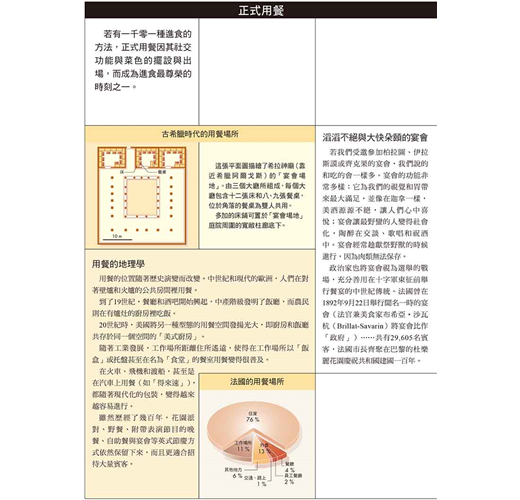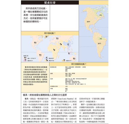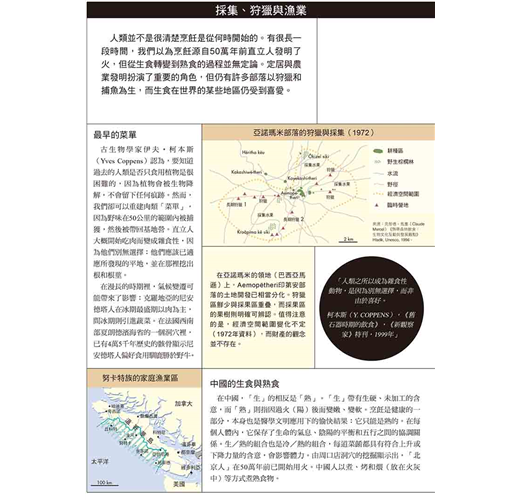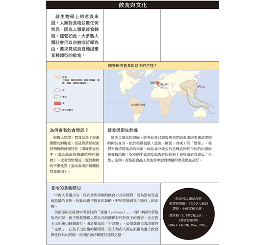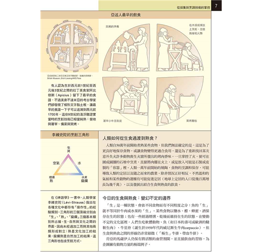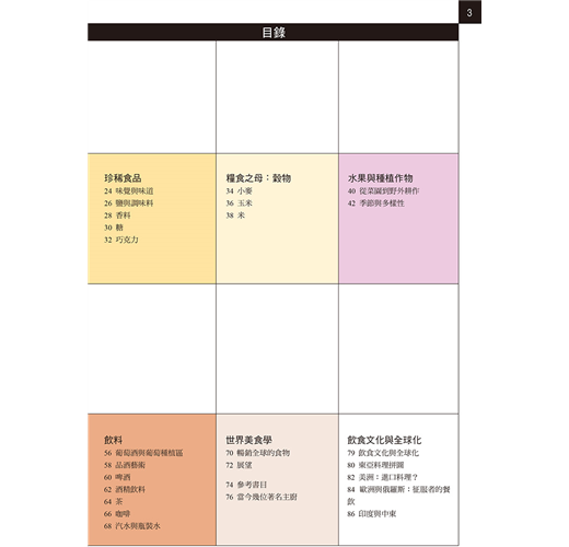 本書從食物來源及烹飪方式談起,主題涵蓋文化及食材兩方面,範圍則擴及全球。從飲食習俗(可食/不可食)、進食習慣(地點、時間等)、餐具、菜餚形式(鄉土、宮廷及文化交流料理)、味覺、調味品、巧克力、主食穀物(小麥、玉米及稻米)、蔬果、各種肉類、海鮮、乳製品、酒精及非酒精性飲料、流通世界飲食到展望未來飲食情況。每一主題以簡要文字說明,穿插大量明確易懂地圖、數據圖及圖表配合解釋主題內容,並挑選相關名人名言引人省思。雖然飲食知識極為龐雜,本書盡量以有限篇幅闡述精要內容。