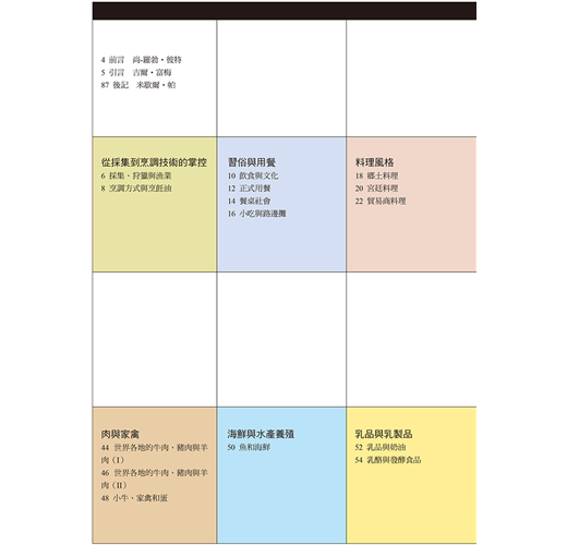 本書從食物來源及烹飪方式談起,主題涵蓋文化及食材兩方面,範圍則擴及全球。從飲食習俗、進食習慣、餐具、菜餚形式、味覺、調味品、巧克力、主食穀物、蔬果、各種肉類、海鮮、乳製品、酒精及非酒精性飲料、流通世界飲食到展望未來飲食情況。