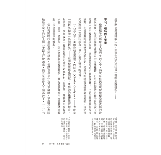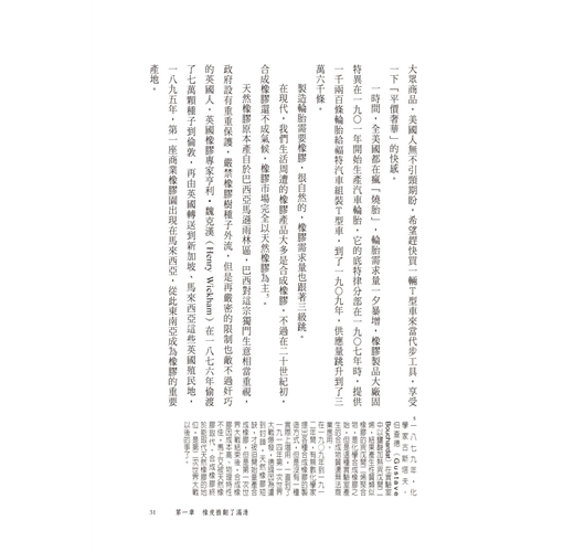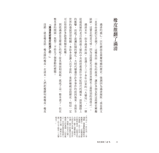 本書以一個聳動的標題「橡皮推翻滿清」,描述福特汽車、橡膠輪胎,東南亞橡膠產業、上海股市、清末中國的泡沫經濟、保路運動,最後造成武昌革命。中間又穿插鴉片戰爭、甲午戰爭、百日維新、太平天國、海防(防日)與陸防(防俄)何者優先之爭議等等。熟悉的歷史題目卻給我們完全不熟悉的幕後內容。黑格爾說:歷史給人最大的教訓就是人類永遠無法從歷史中學到教訓。我想最重要的一個理由是我們常常只看到歷史的表象,卻沒追究它的來龍去脈。所以我們讀歷史,常只記得死板的條文,例如:一八九四年發生甲午戰爭,卻沒深究日清黃海海戰,為何北洋艦隊戰敗?不知原因,當然也無從改進了。