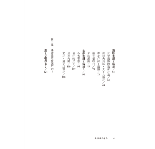 本書以一個聳動的標題「橡皮推翻滿清」,描述福特汽車、橡膠輪胎,東南亞橡膠產業、上海股市、清末中國的泡沫經濟、保路運動,最後造成武昌革命。中間又穿插鴉片戰爭、甲午戰爭、百日維新、太平天國、海防(防日)與陸防(防俄)何者優先之爭議等等。熟悉的歷史題目卻給我們完全不熟悉的幕後內容。黑格爾說:歷史給人最大的教訓就是人類永遠無法從歷史中學到教訓...