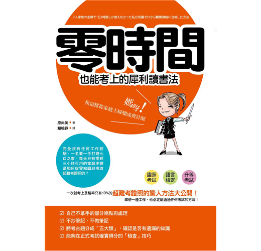 一個大學畢業後,就隨即結婚嫁入擁有六口之家的主婦,她沒有過任何工作經驗,對於要考的稅物代理人相關知識也是完全的空白,而且為了照顧那一大家子,她一天要煮兩次三餐、要忙著看似永遠都忙不完的家務。一天中,頂多只有3個小時是屬於自己的時間(而且還是零碎的。)但這樣的她,在利用了自己獨特的讀書法後,一年年考取稅物代理人相關證照,而且每次都是一考就過,終在五年後,成功成為稅務代理人,並開設了一間擁有20名員工的會計事務所。本書正是這位主婦獨特的讀書筆記,教各位如何利用最少的時間,獲取最大的成果。