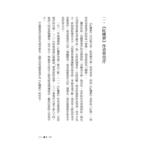 一九二一年胡適發表〈紅樓夢考證〉提出三點:(一)《紅樓夢》作者是曹雪芹,且是雪芹的自傳。(二)內容寫清朝江甯織造3曹寅家的故事。(三)曹雪芹只留下前八十回,後四十回是高鶚續寫。迄今為止,學術界大部分人接受前述胡適說法,雖然反對的人仍然不少。