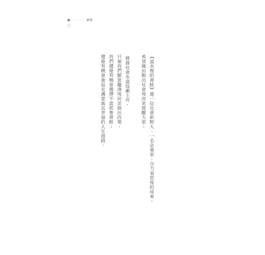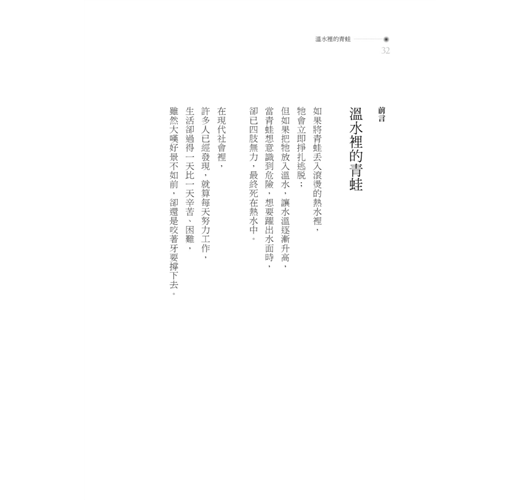 最後願那溫水裡的青蛙都不是你我,若你不幸已浸在裡面,請趕快跳出來,因為逃避不能解決問題,悲傷只能自艾自憐;未來要靠自己創造,唯有更積極、更奮起,目標理想才可能離我們愈來愈近。